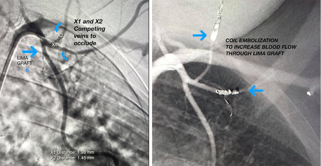 Patient with recurrent chest pain. Patient has had a LIMA Graft placed previously. LIMA- Left Internal Mammary Artery used for CABG - Coronary Artery bypass grafting. Competing arteries can take away blood flow through the LIMA graft. Dr. Meka received this patient and used coil embolization to block off the competing arteries (X1 and X2) and revascularize the LIMA graft by occluding the competing arteries.